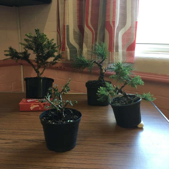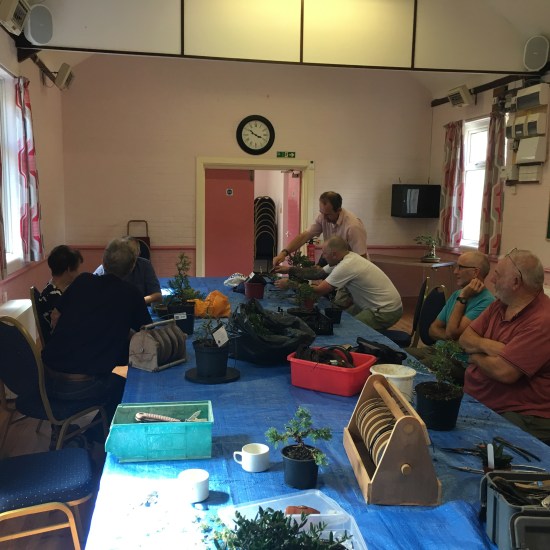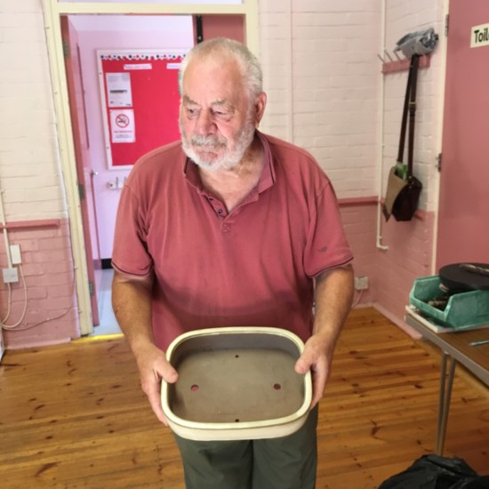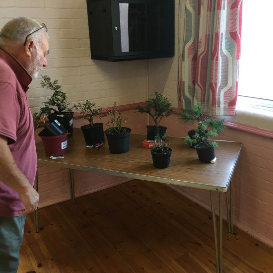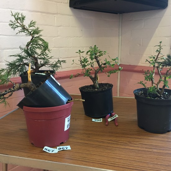 This month saw a new event in the calendar for the club. Members were challenged to find some raw material from garden centre or nursery stock and create a bonsai from scratch with that material during the meeting. Once everyone was done, the trees were brought together so everyone could cast a vote for their favourite tree. With the votes counted the winner decided as John Mason. He can be seen in these photos with the pot he received as prize. Well done John!