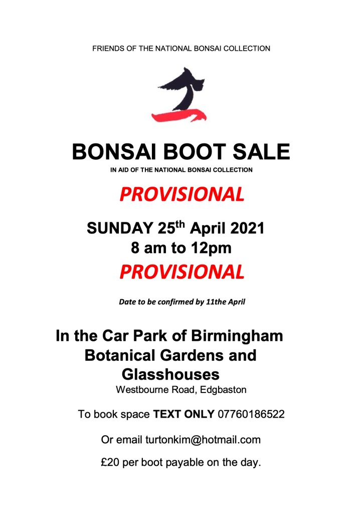 FNBC are pleased to announce that they have a PROVISIONAL date for a spring Bonsai Boot Sale. They hope to hold it at the usual venue of the Car Park of Birmingham Botanical Gardens on Sunday 25th April 2021. This will depend on the national Covid 19 regulations at the time.