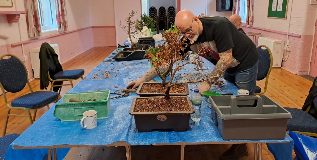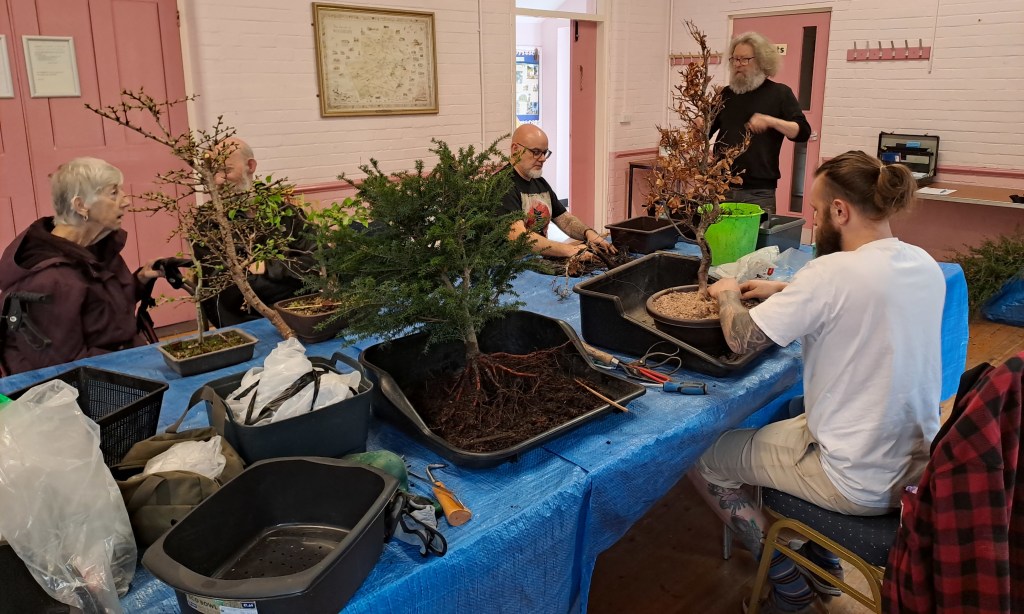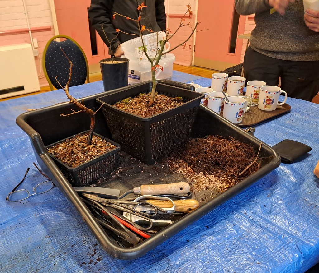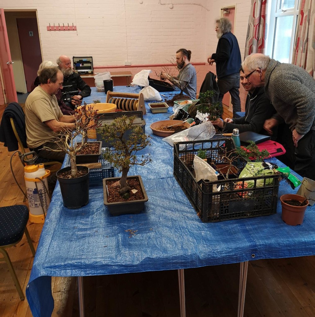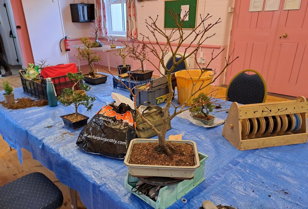 February’s meeting saw a number of members starting work on the Spring repotting of their trees, ready for the growing season. Some trees went into bonsai pots while others were put into pond baskets to help develop a fine root system, thicken the trunk and create their initial style.