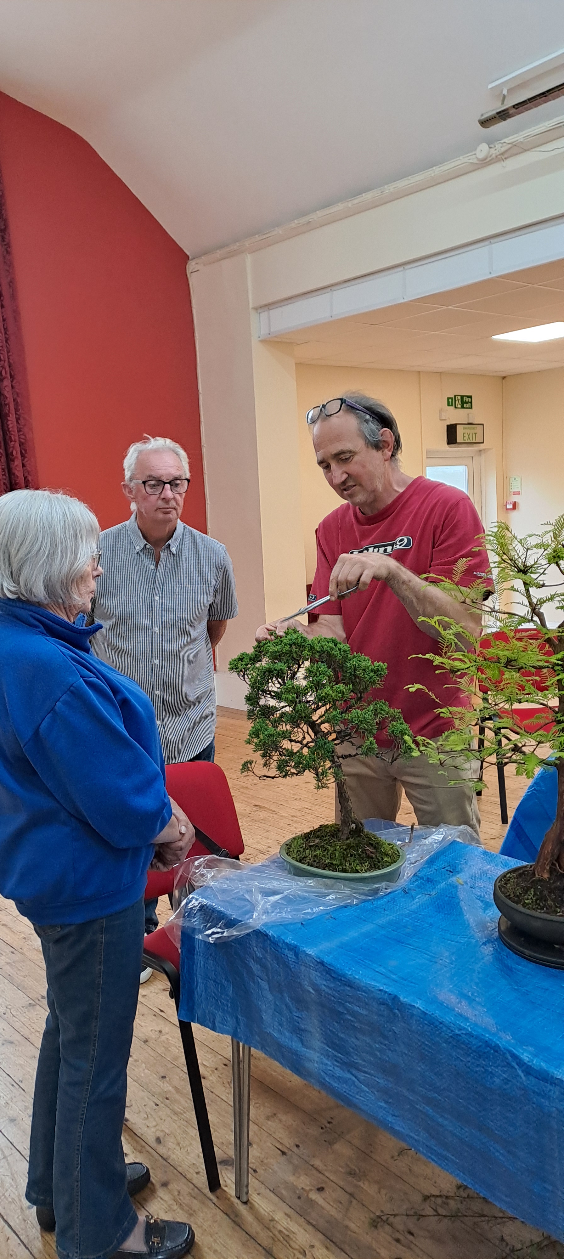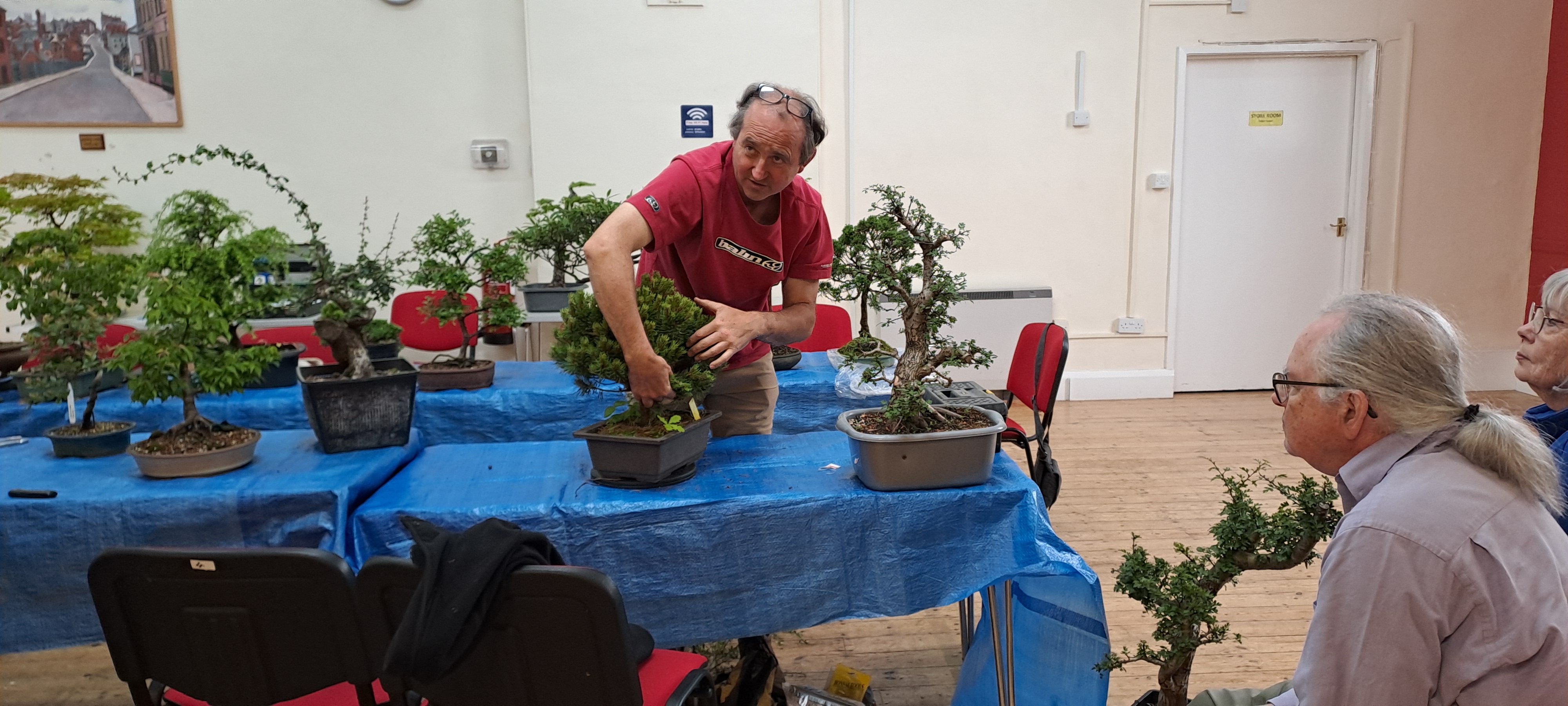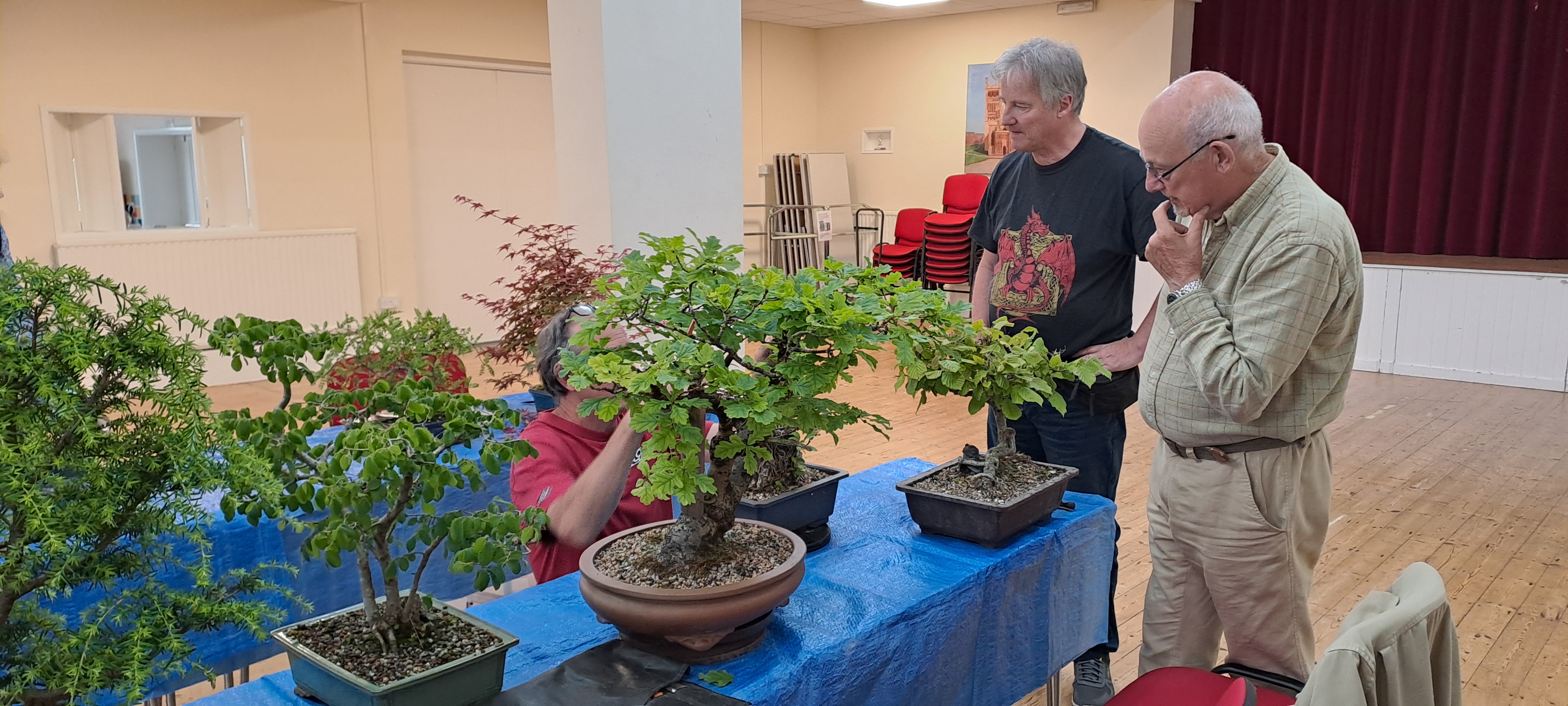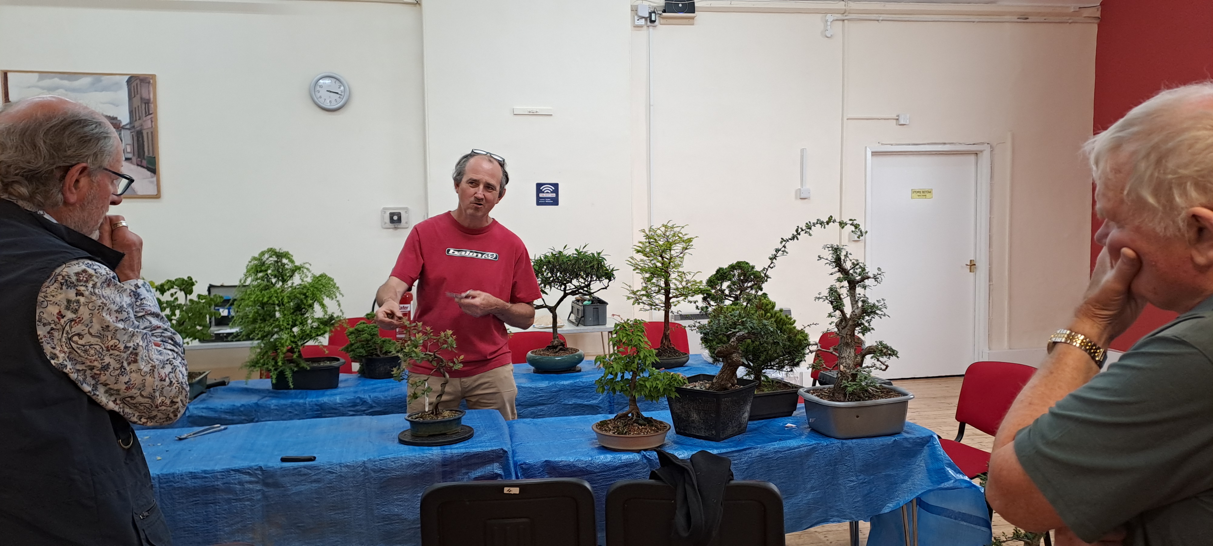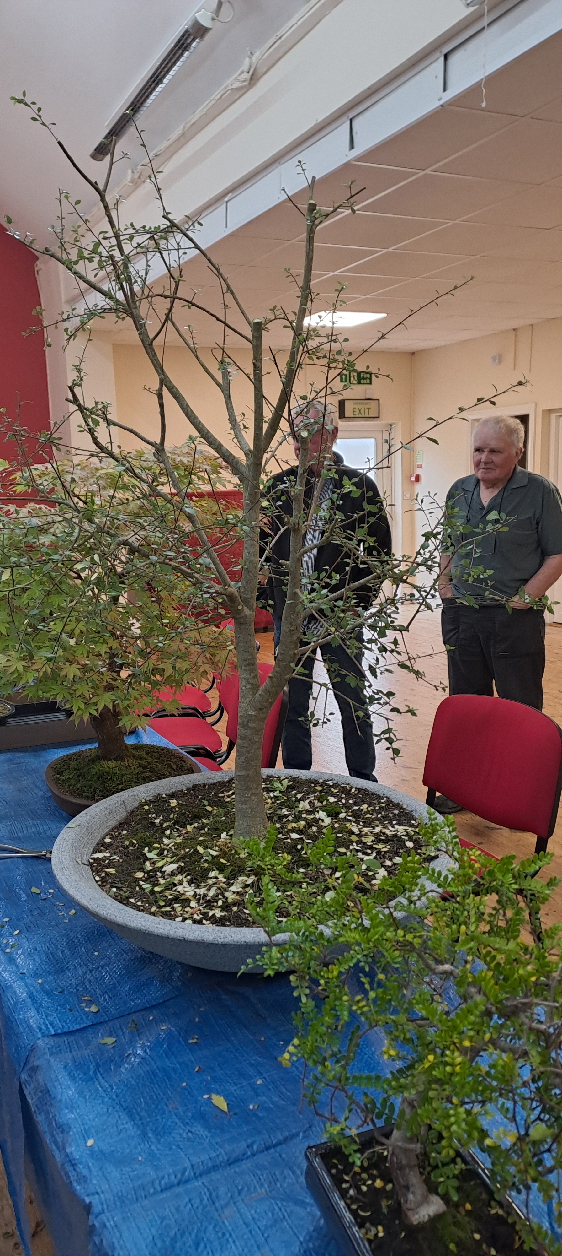 An excellent variety of tree species were brought along for styling advice, including a large flowering tree native to New Zealand called a Hoheria, which is not commonly seen as bonsai in the UK (also known as lacebark or ribbonwood). This tree was over 5 feet tall! After some discussion it was decided to reduce some of the branches in order to bring the tree to a more suitable size. This followed observation of its response to previous pruning by the owner. Hopefully the tree will respond by sending out many inner buds which in time can be used to build out a much more compact tree. Other trees of note included a wonderful old Oak tree with very naturalistic styling, several different cultivars of Japanese maple, as well as Mugo Pine, Hawthorns and Hemlock. Many thanks to Neil for getting through all the trees and providing his valuable advice. Also thanks to Jock for welcoming us to our new venue.